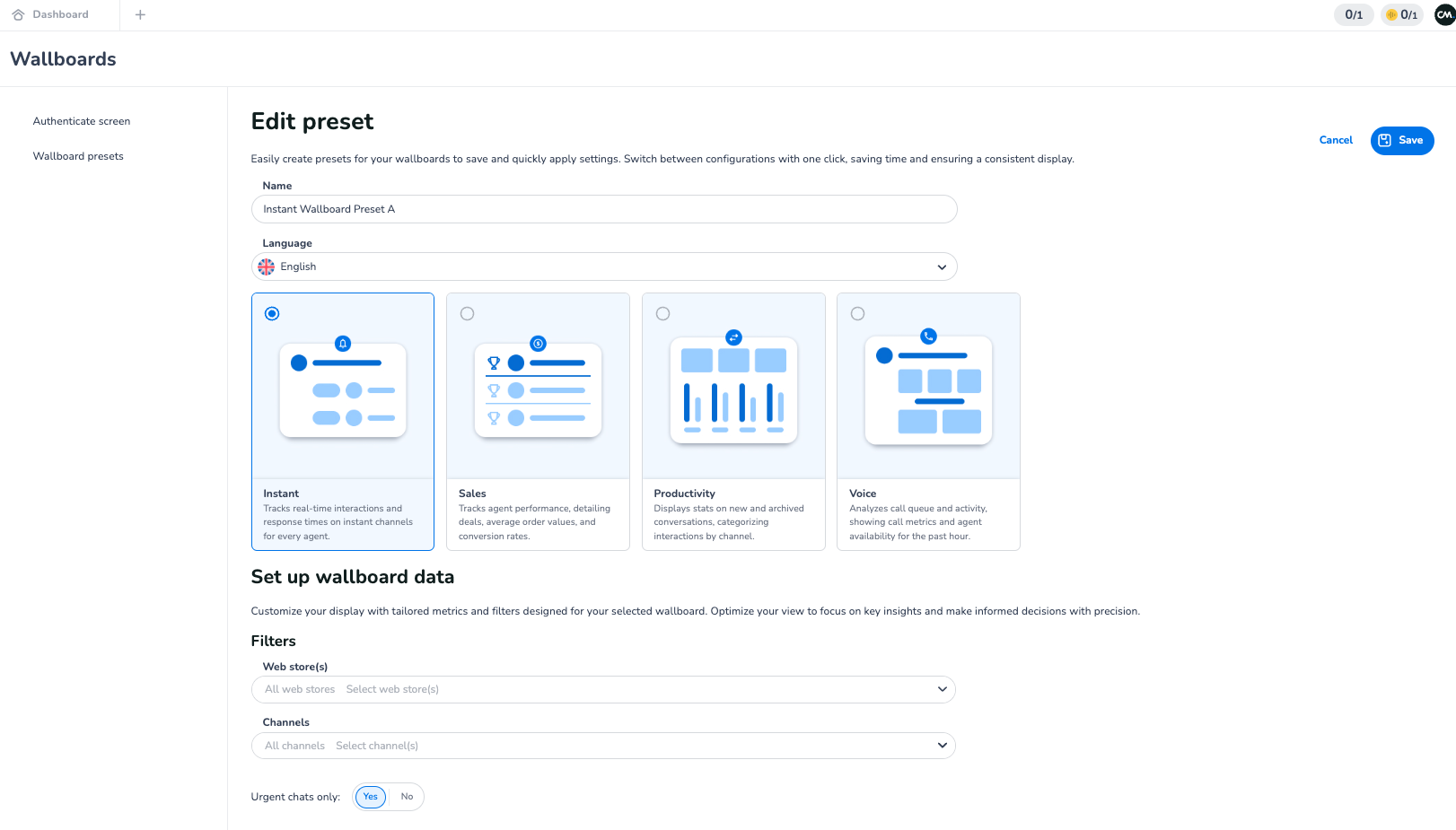 The Wallboards preset configuration interface allows you to easily create, edit, and delete wallboard presets within the Agent Inbox environment, enabling you to conveniently manage what is displayed on your wallboards. This eliminates the need for direct access to screens displaying the wallboards in order to configure the necessary insights.