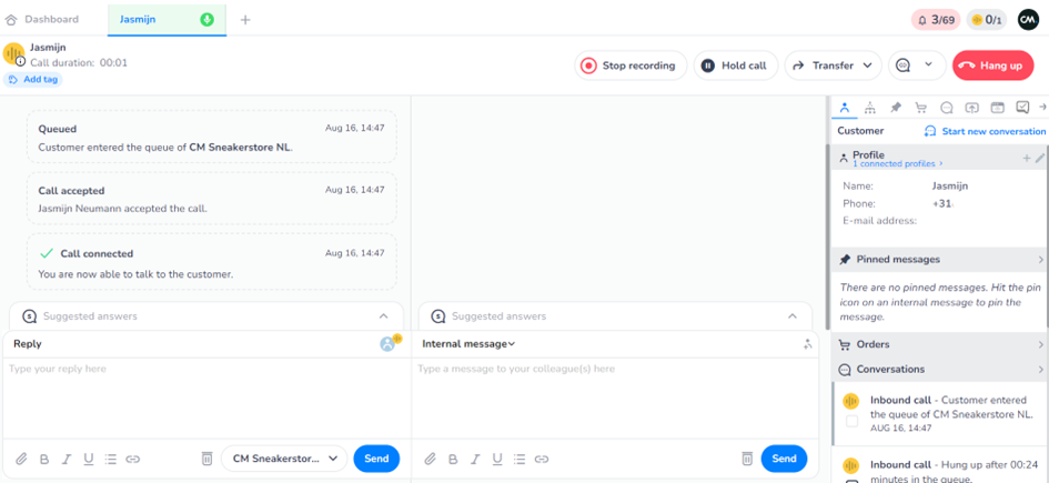 When you click to accept an incoming phone call, you will be connected to the customer, and a conversation window will open. On the left side of the window, you can see the call log. If you have call recording enabled, it will automatically start when the call is connected and will also appear in the call log.