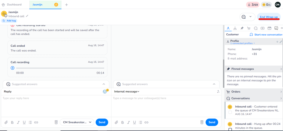 When you end the conversation with the customer and either they or you hang up the call, you will enter wrap-up stage. Wrap up stage is necessary because otherwise you will go straight back into availability for new incoming phone calls after ending a call. Wrap-up time can be used to finish any admin you need to do before going back into availability. During this time, you will get the status ‘busy’. When you’re ready, you can end the wrap-up and your status will change back to ‘available’.