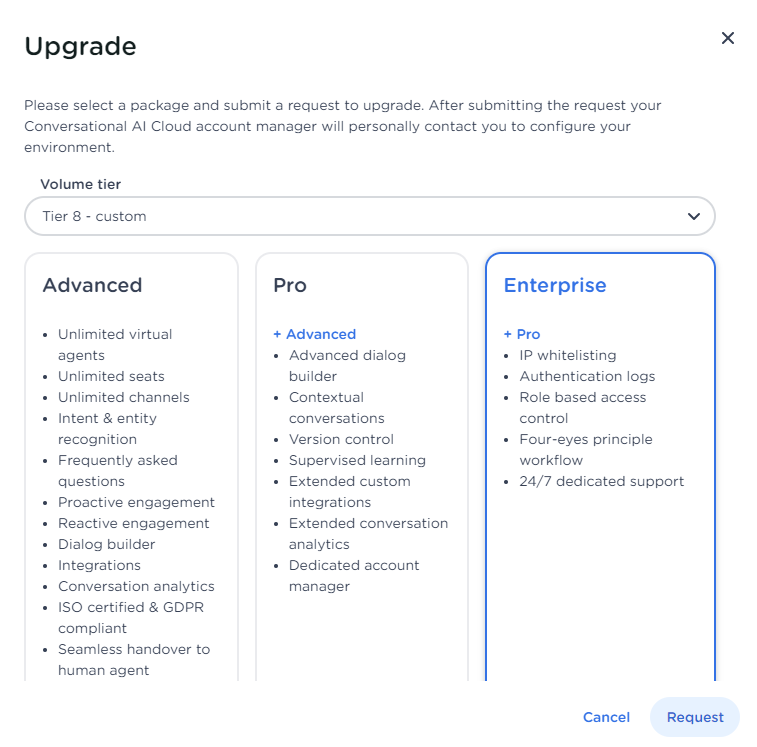 To request to upgrade your package, click on the “Upgrade” button above your account details. After submitting the request your Conversational AI Cloud account manager will personally contact you to configure your environment.