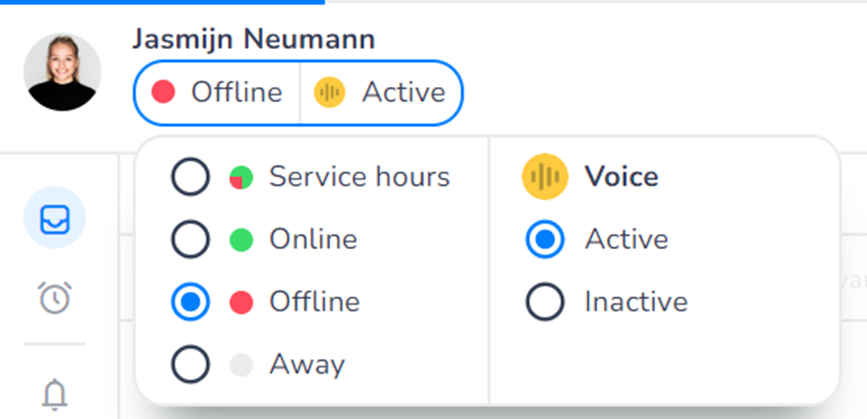 When logging in and going to your dashboard, the first thing you may notice, is that there are additional status options available for voice: Active and Inactive. This simply means you are either available for new incoming phone calls, or you are unavailable for new phone calls. These new status are separate from the existing ones, because you may want to be offline for livechat, but available for phone calls, or online on the livechat, but unavailable for phone calls.