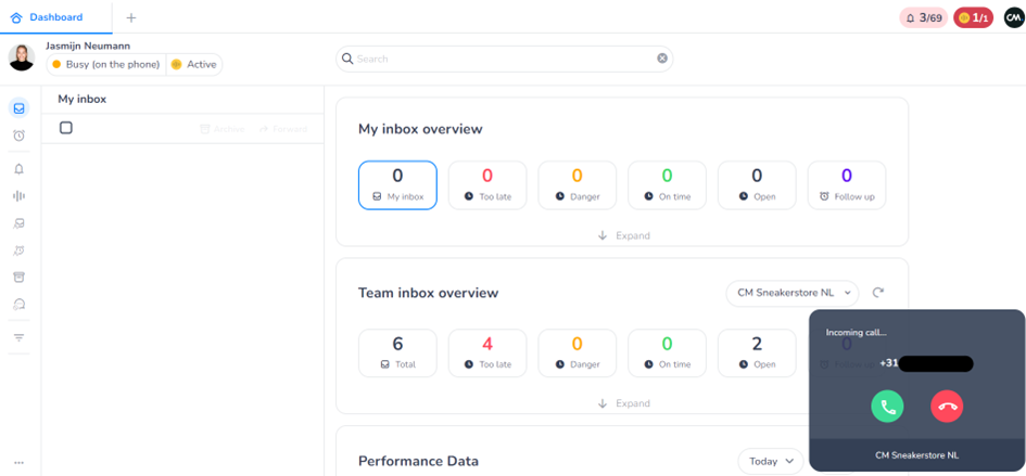 When you switch your status to Active, the number on the right will change and you can receive a phone call. The banner with the phone call will stay on screen for 18 seconds and you can either accept, in which case a conversation screen will be opened and you will be connected with the customer, or you can decline.