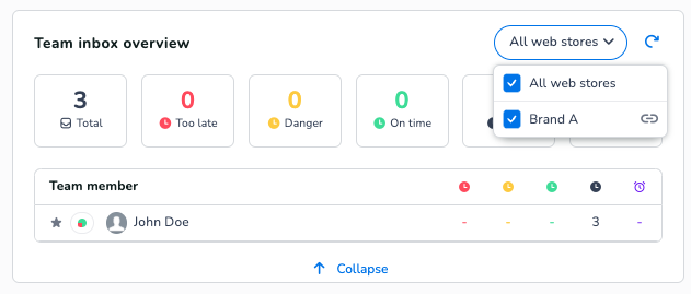 Different from my inbox overview is that the team inbox overview doesn't refresh automatically. You can refresh the team inbox overview by clicking on the refresh button (see below) or when switching from my inbox overview to the team inbox overview when you click on the total tile for example.
