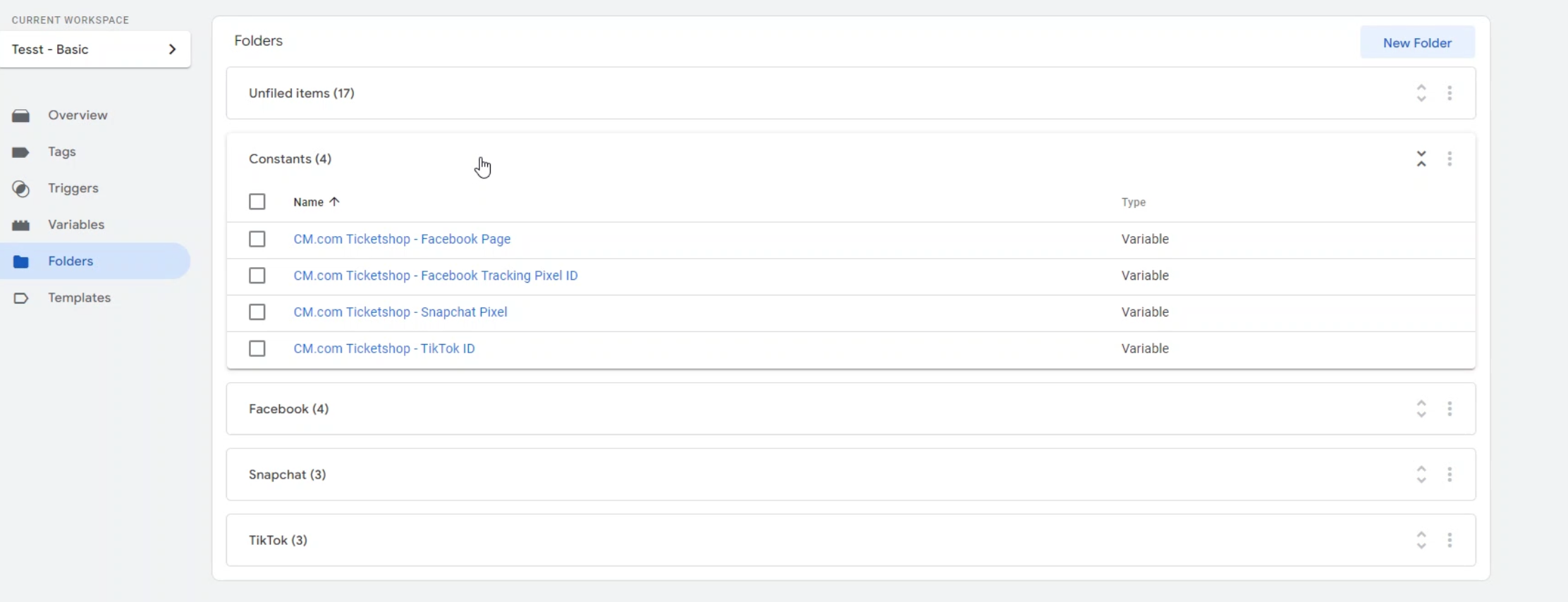 This will present an overview of the one constant per tracking platform. If you set up the Basic container this will result in constants for Google Analytics and Google Ads. If you set up the Advanced container this will result in constants for Snapchat, Facebook and the TikTok pixel