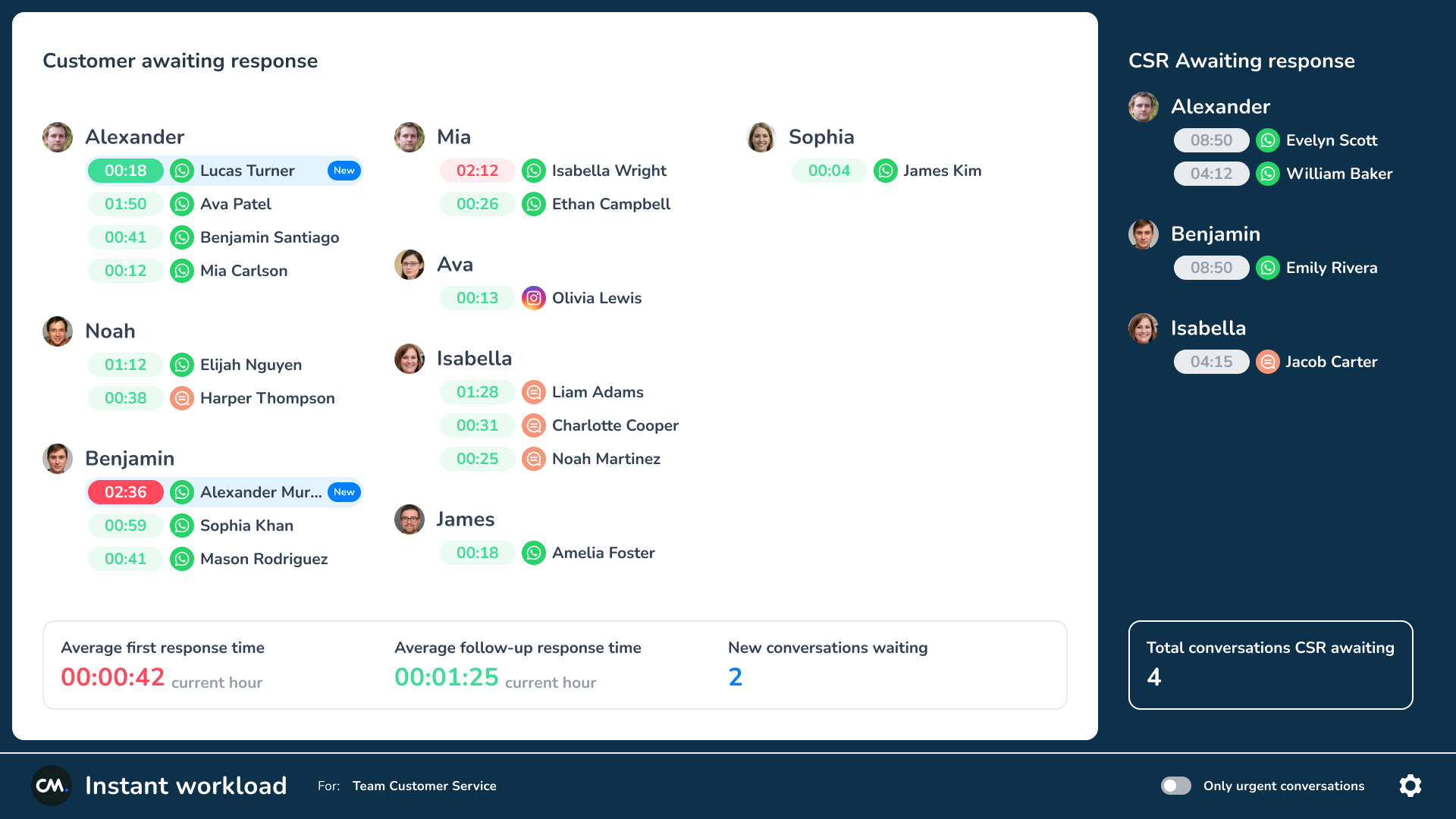 The Instant Wallboard provides insights to manage the workload of instant conversations. The Wallboard is divided in two columns: Customer awaiting response and CSR awaiting response. All conversations are grouped by ownership. So you’ll see the agent and their conversations in both columns. All conversations show the waiting time, name and channel icon.