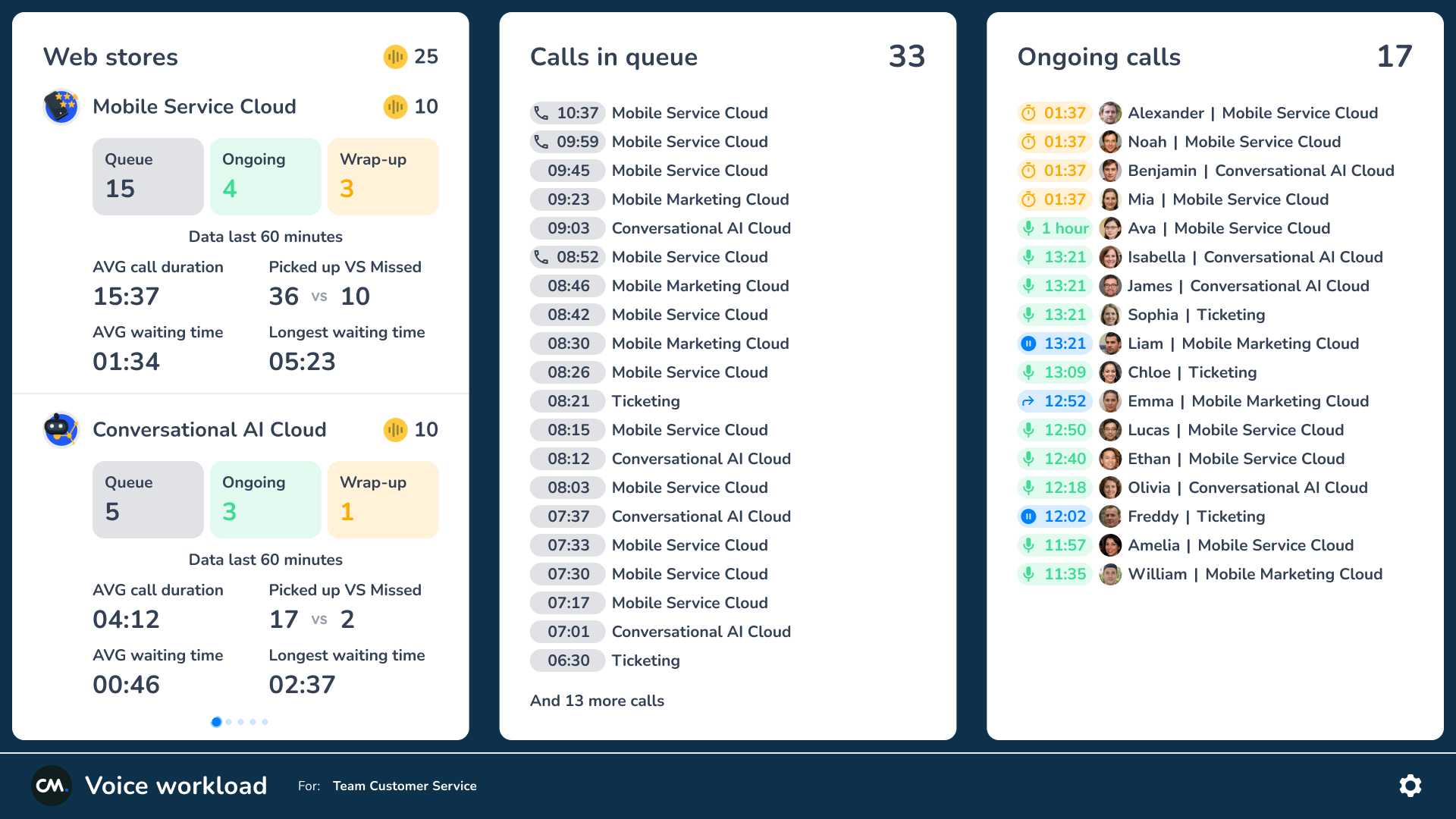 For our Native Voice channel, we have a separate Wallboard that provides insights to manage the workload. The Wallboard is divided in three columns: Web store overview, Calls in queue, and Ongoing calls.