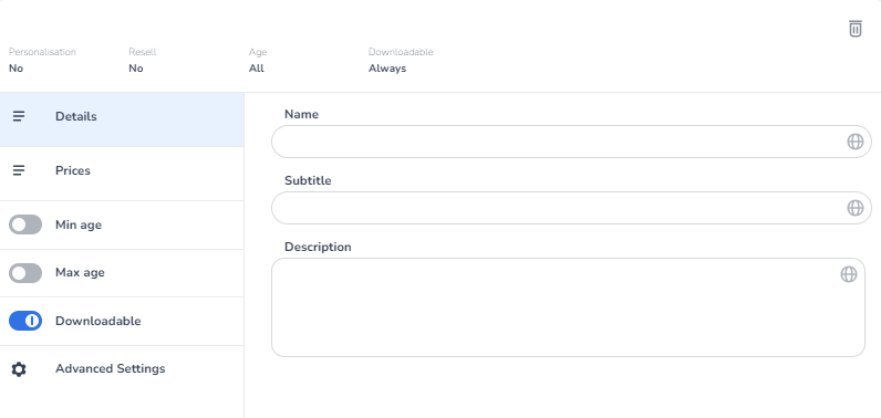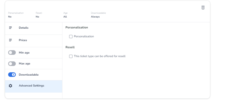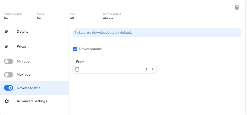 The downloadable button will give you the option to make it possible that the ticket buyer is not able to download their e-tickets because you want to give them out closer to the event, or the layout is not ready yet. But please keep this button on as much as possible. if you want your ticket buyers to have later access to the tickets please do this in the shop and email settings and not here. Only when you are never giving out tickets you can check this button off.
