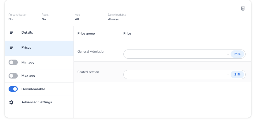 You can also adjust the VAT percentage for each price category within a ticket type.
