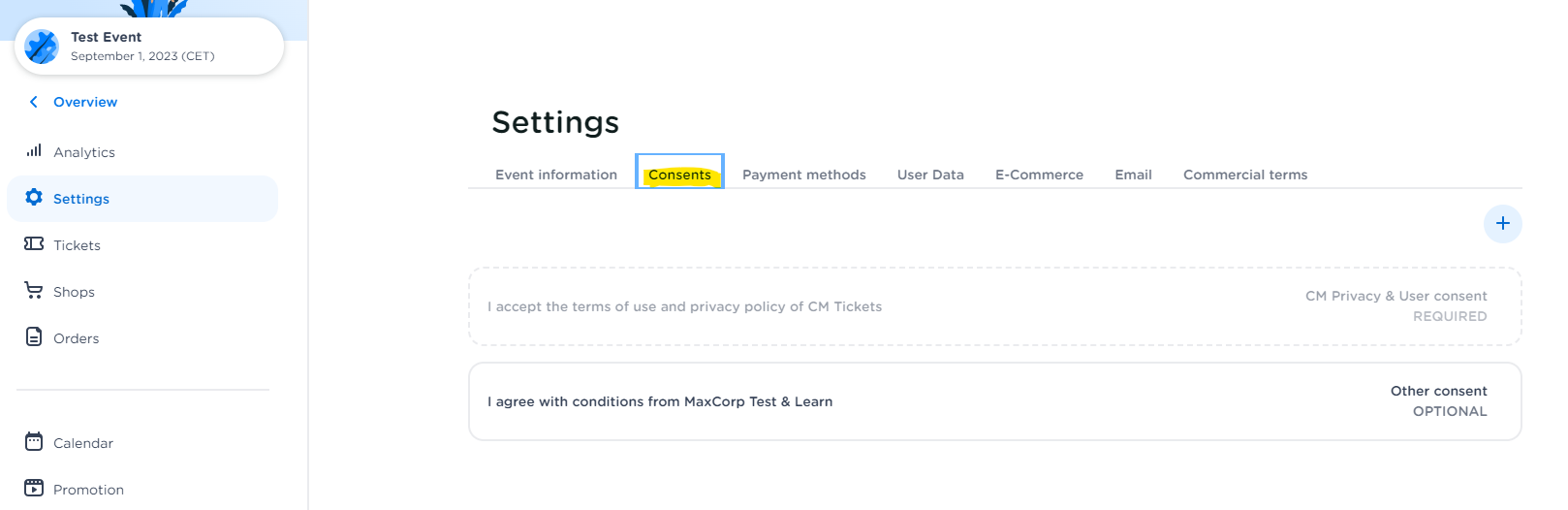 If you want to ask your visitors to agree to your general terms and conditions, privacy policy or other (legal) agreements, create 'consents'. Here visitors have to give their consent in order to be able to store certain data. These consents will be shown to visitors during the purchase process. You can find this feature by navigation to the ticketing dashboard via Settings -> Consents.