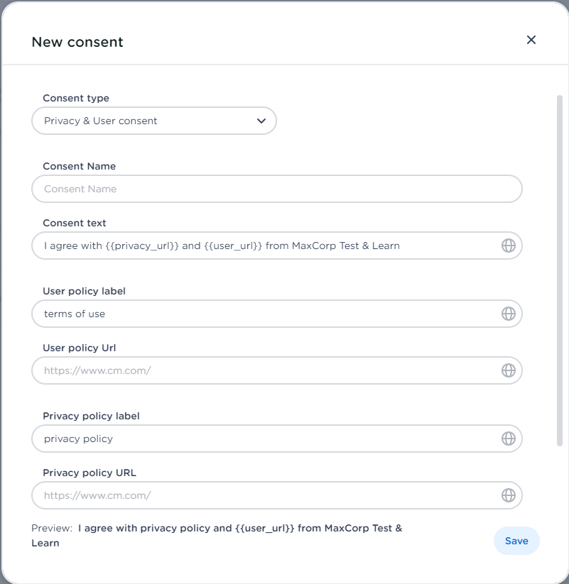 Click the + icon to create a new consent. You can select 3 options: privacy & user consent, marketing or other. Within the privacy & user consent you can customize your own terms & conditions text and link to these specific documents. You can select if a consent is optional or required and to which events (all or one in specific) this applies.