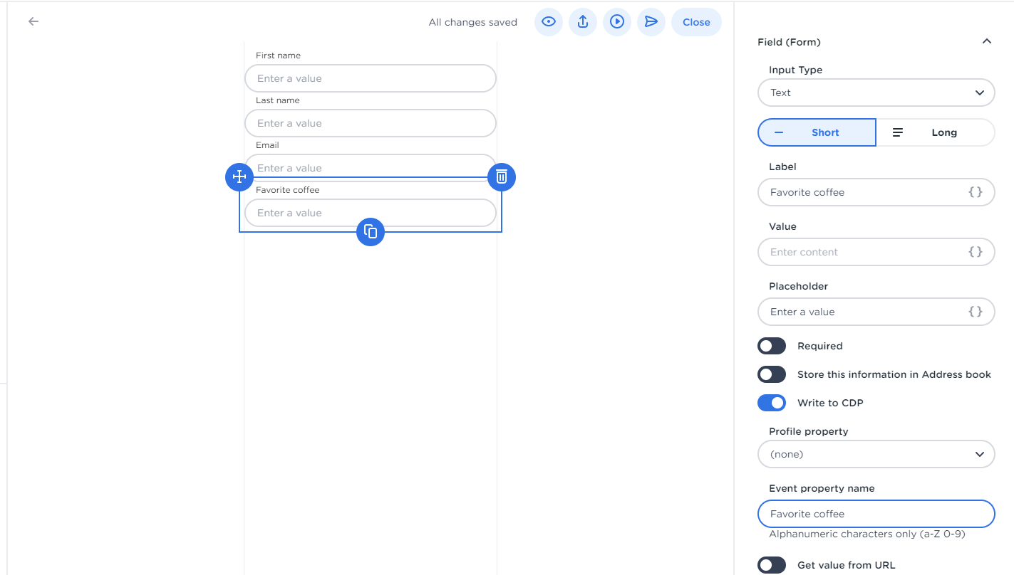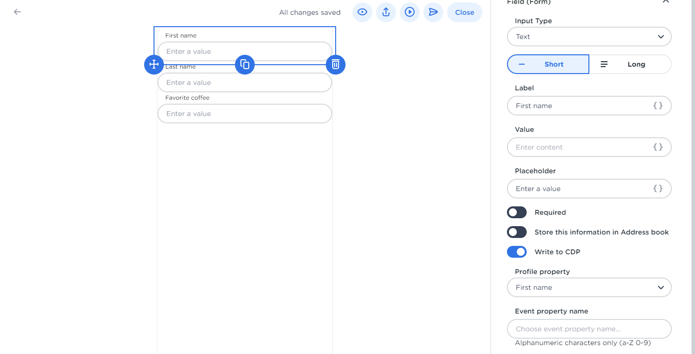 3. For every field, dropdown or checkbox added to your form toggle the radio button “Write to CDP field” to blue.