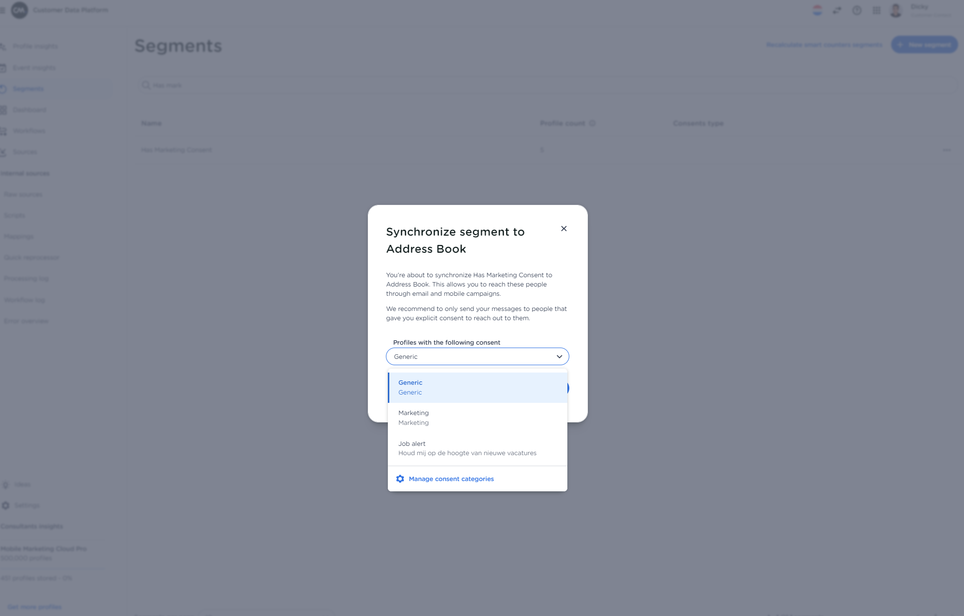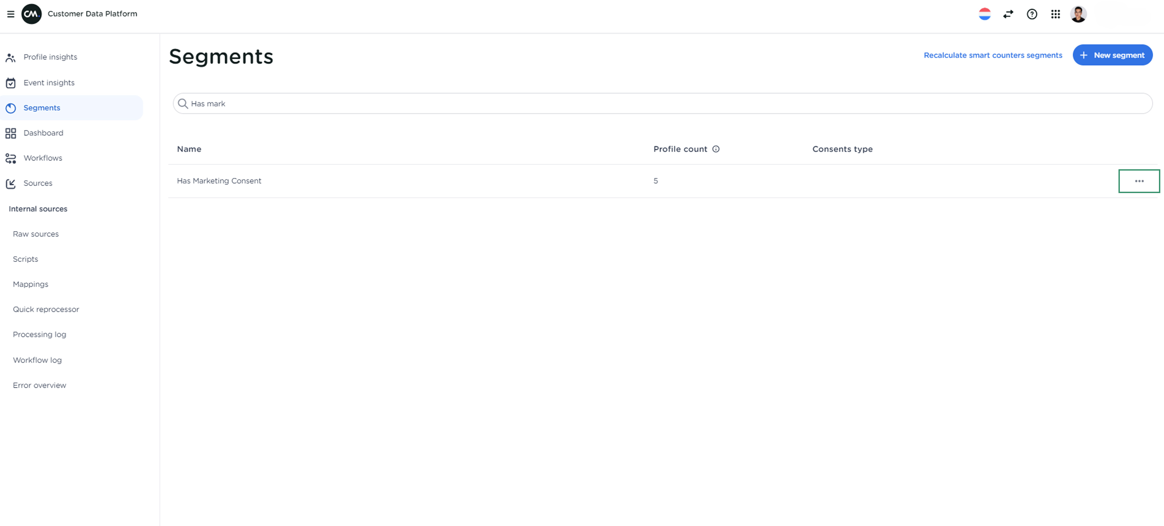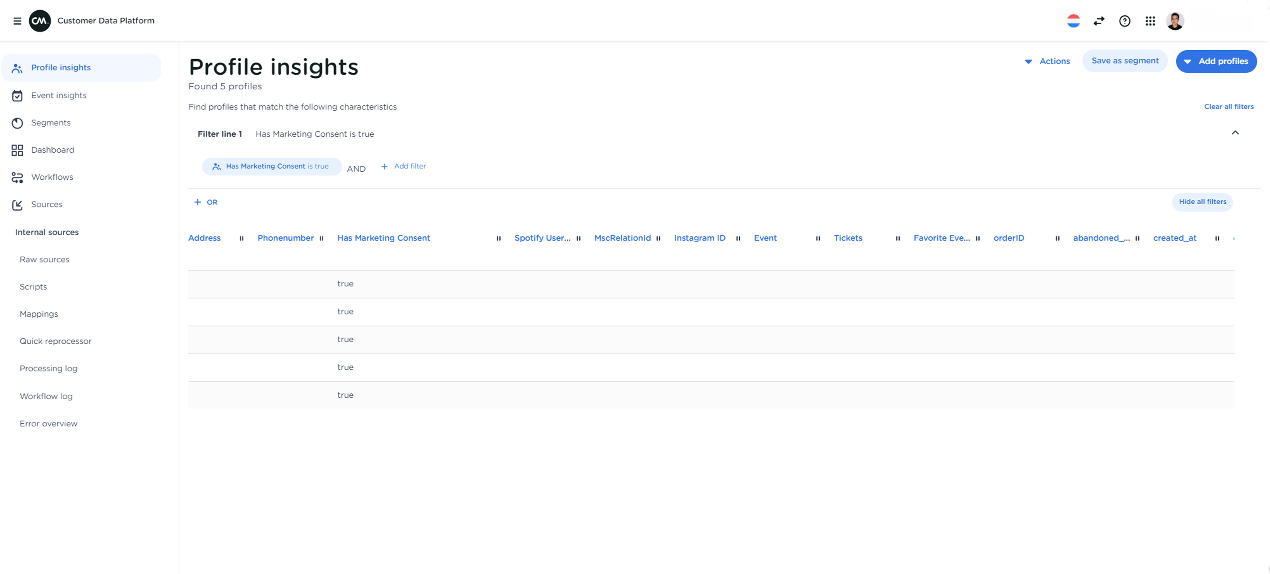 You will get an overview of profiles that has given consent. Save this as a segment with the blue button in the top right corner.