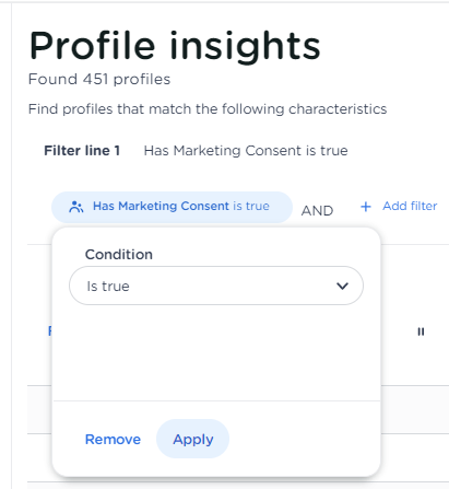 To create a segment we need to find people who has given consent. Go to profile insights and add filter.