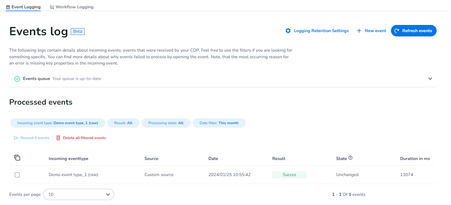 Using the above example, when posting to the endpoint provided with the JSON body as setup, you see the log line in your event logging and that is was processed successful. When opening the logline you can also navigate to the profile that was created based on this event.