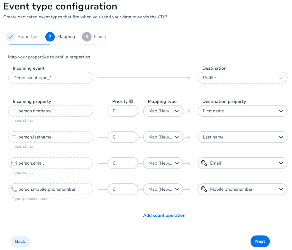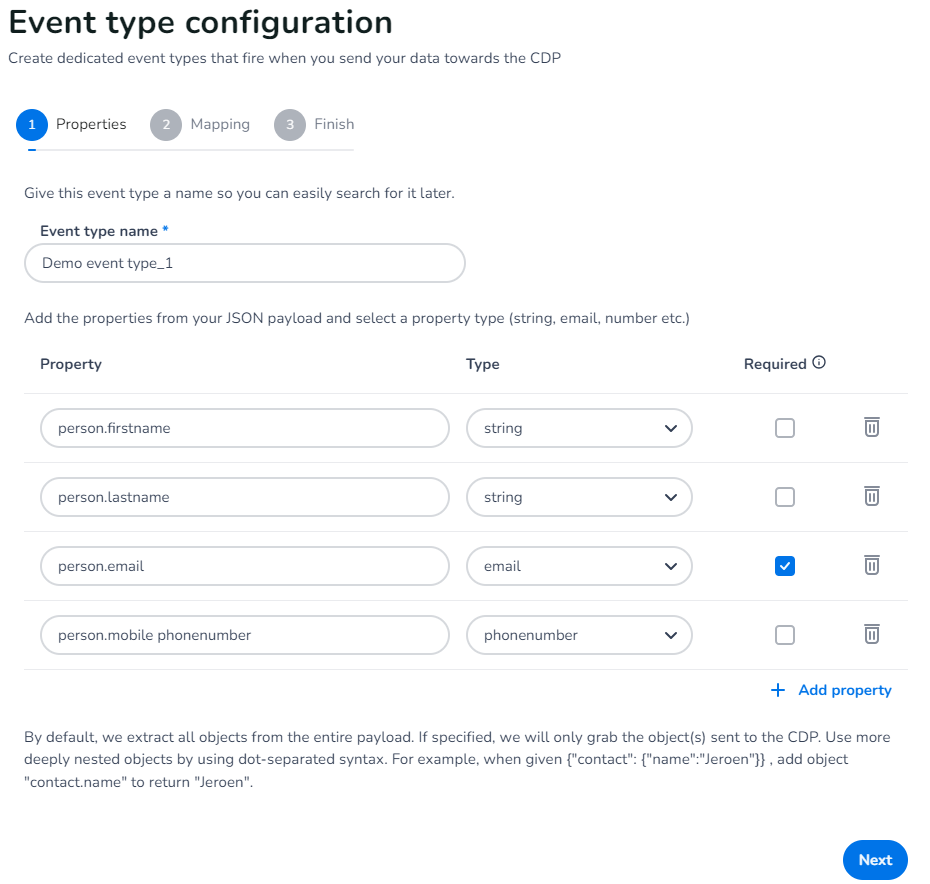 Now that you have setup your incoming event, the data needs to be mapped to profile data. Map your incoming properties to a profile property in your CDP. If the property does not exist yet in the CDP, you can create it in the profile definition of your account (settings).