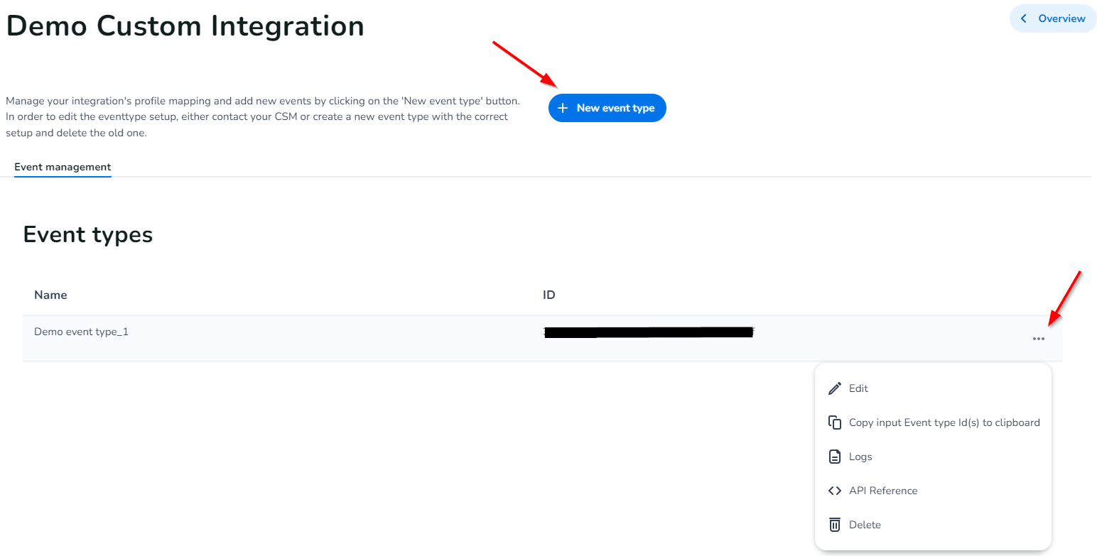 If in a later stage you want to add more event types to your integration, you can do this from here by clicking on the 'New event type' button and follow the same wizard.