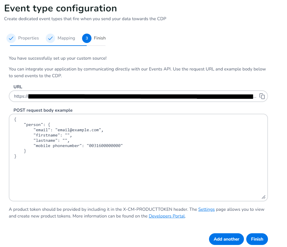 The wizard ends with a success page stating the POST endpoint to use and an example JSON based on your input fields. You can use this endpoint in combination with an API product token (settings - tokens) to start sending events to the CDP.