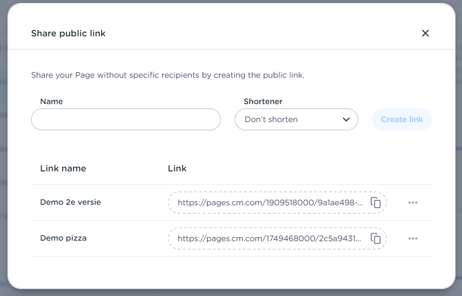 A Page can also be published publicly in multiple instances to differentiate end user behaviour over multiple public links. For example this might be beneficial when a form is shared publicly by different people, on different websites or using ads on multiple social media. Generating multiple public instances of a Page is simply repeating the steps to publish a single public link. The public instances will then be shown in a list as shown below.