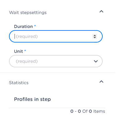 - Wait step: this option creates time between a trigger and a step, or between two steps. When selecting this step you can fill in the duration and the unit on the right hand side: