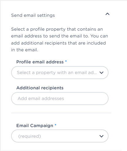This is the settings tab that will open when you have selected this step. In the first option you will select the profile field to which the email needs to be send. Most of the time this will be: Email.