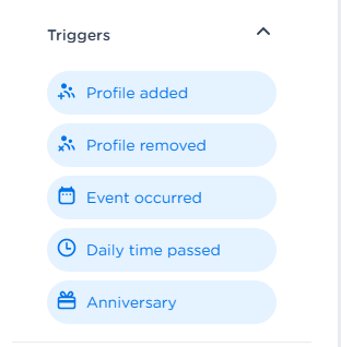 - Anniversary trigger: starst when a specific date is met for a specific segment. Here you have to select the segment of which you want to trigger the workflow, and the date property on which it needs to trigger. If there are no date properties available, you have to add it to your data in the Customer Data Platform. This trigger can be helpful in the case of communicating on somebody's birthday.