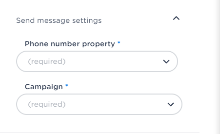 These are the settings that will open when selecting this step. In the phone number property you select the field that the campaign needs to be send to. Mostly, that will be Mobile phonenumber.