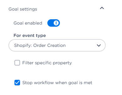 Below those settings you also have the option to enable a specific goal for your workflow. This can be helpful if you want to stop sending e-mail campaigns when, for example, and order has been placed. This can be an example of that (note that Shopify is an external integration with the CDP):