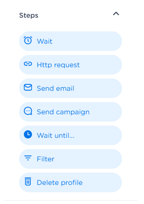 - HTTP step: this is for API calls in the workflow. Please contact your Data Consultant if you want to use this step.