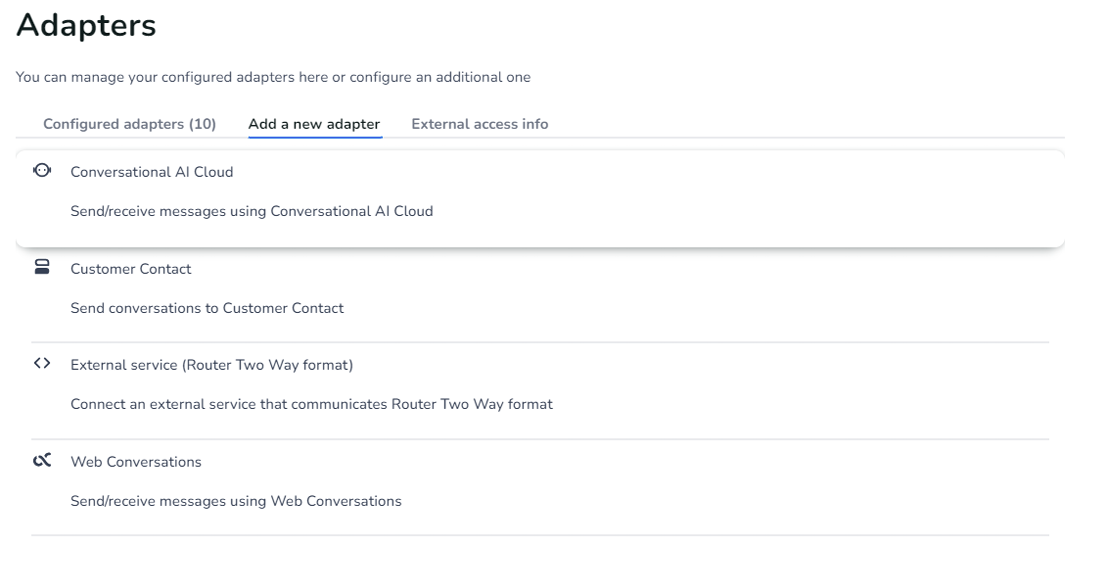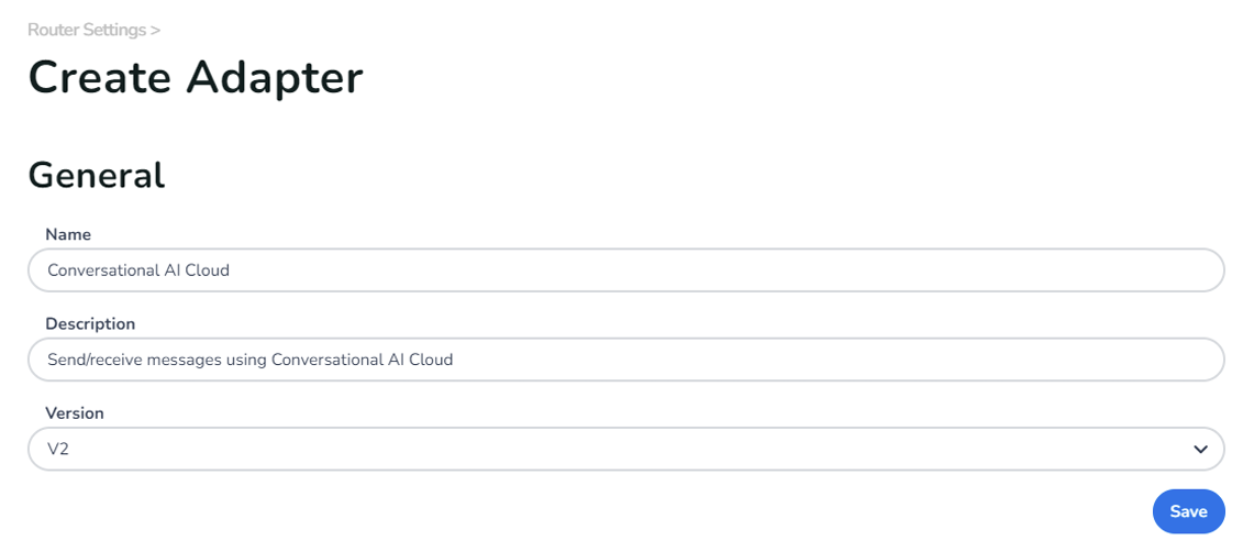 Conversational AI Cloud adapter ID: This is the Conversational AI Cloud adapter ID in your router environment.