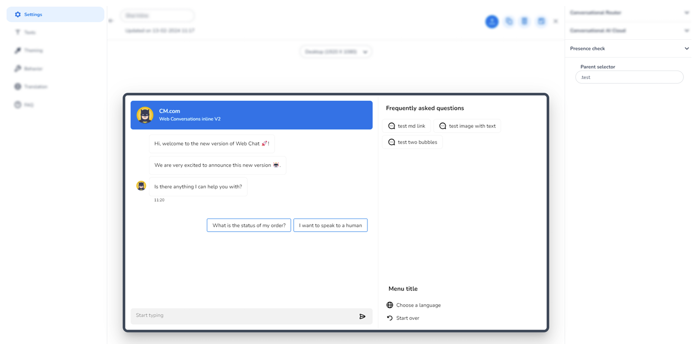 The prerequisites to setup a inline V2 Web Conversations are as followed: Conversational AI Cloud environment Mobile Service Cloud Advanced/Pro environment CM.com platform account.