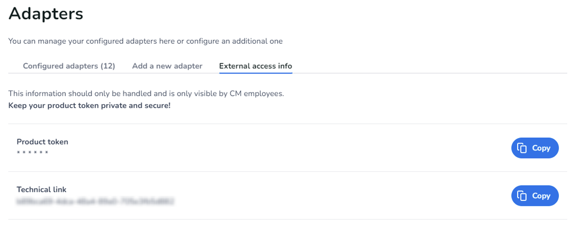 - Go to ‘Settingsʼ and fill in the following fields: ‘Product tokenʼ: This is your Conversational Router product token. The product token can be found in your Conversational router environment under ‘External acces infoʼ