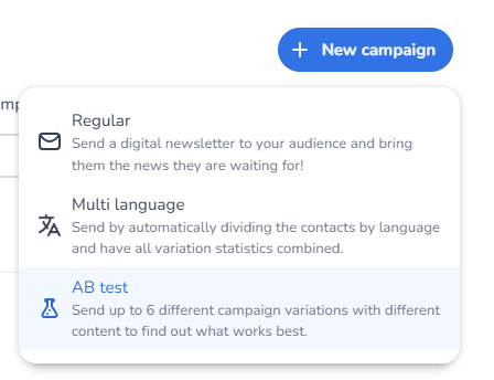 To start a A/B test campaign, you have to start a new newsletter campaign and select the A/B test type.