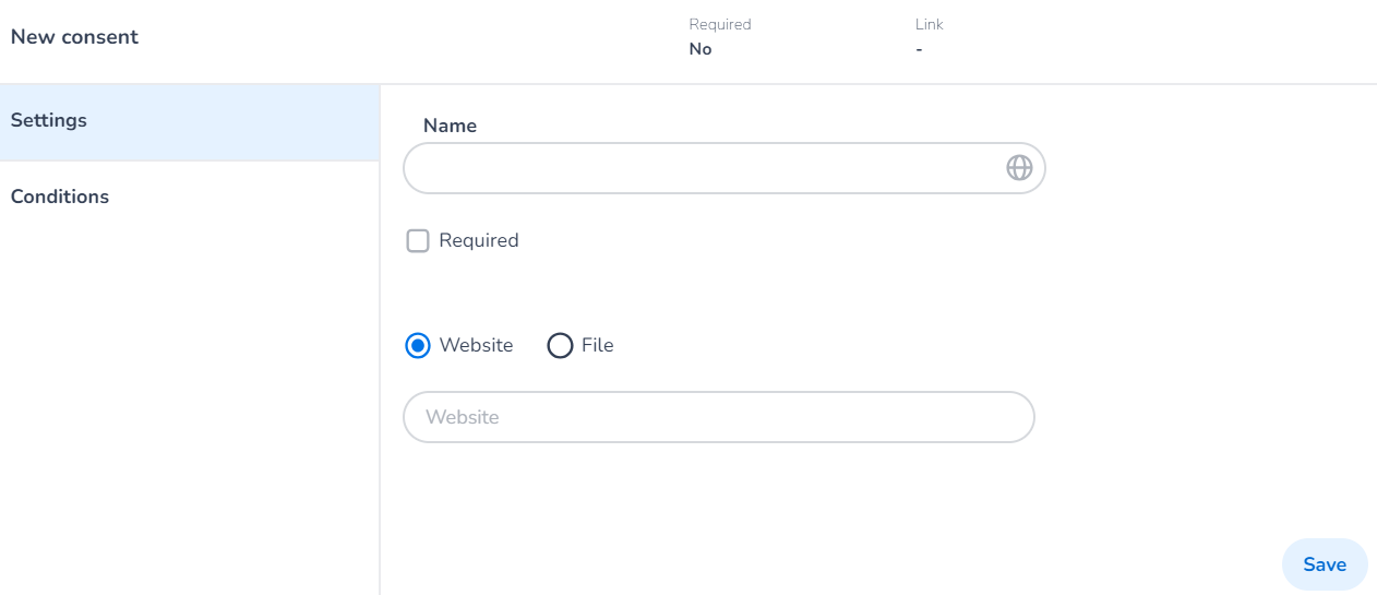 Give the consent a name, select if it is required, and you can add a link to a website or a file. This is commonly used to link to a general terms, or a privacy policy. A marketing consent is never required, because people need to select is themselves. We can not make something mandatory if it is optional.