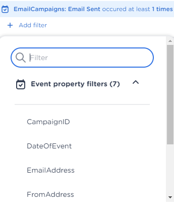 You can further specify your filter settings by configuring event properties within the event type that you just selected. Click on "Refine event by..." and add a filter, now you see all the event properties. Select the event property that you would like to filter on, add the condition, and apply the filter.