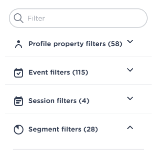 Go to the Customer Data Platform and select the filter in Profile insights. If you scroll down, you can find all the event types and sessions.