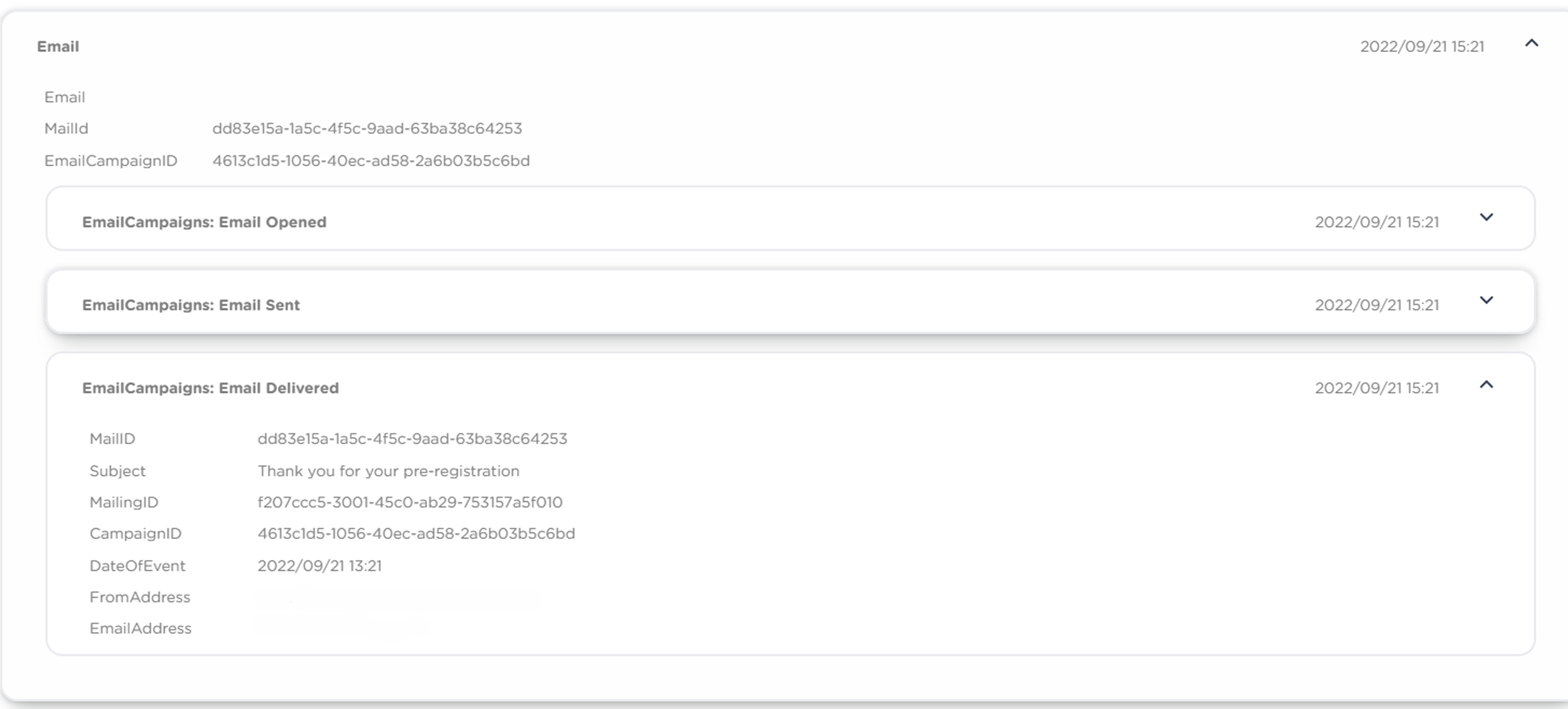 All Incoming data points, such as an email click, pre-registration, ticket sale, are called events in the Customer Data Platform (CDP). Profiles are being built up out of these events. Each event type has its own event properties, for examples pre-registration and email click: