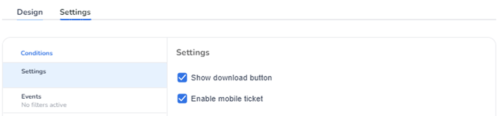 When navigating to Setting in the menu, you can set up for which tickets the template should be applicable by adding a new rule. Within this menu, head over to settings again to switch the show download button on or off, depending on your wishes. You can also enable/disable the mobile ticket.