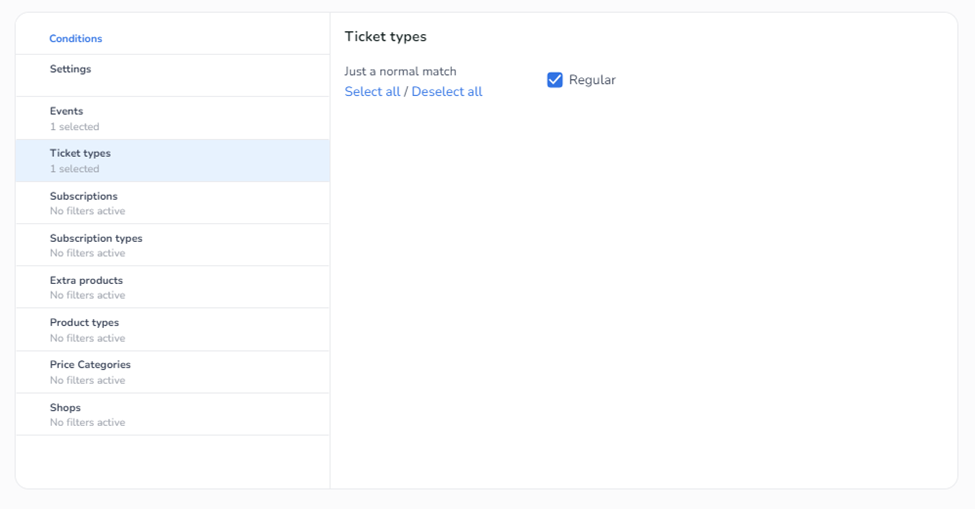First, select the event or subscription by checking one of the boxes. Then, go to Ticket Types or Subscription Types to choose the ticket type to which the template should apply. If you would like to set up the same template for both Ticket Types and Subscription Types, please remember to add separate rules for each; otherwise, it will not be set up correctly. Additionally, ensure that the Shops filter remains unchanged. Selecting a ticket shop here will result in the template being applied only to tickets purchased through that specific shop, and it will exclude any orders created via the dashboard.