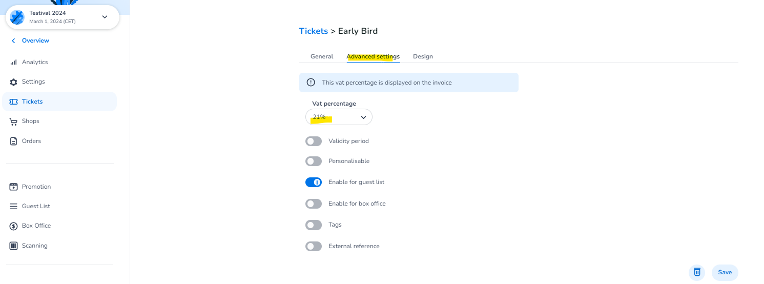 Navigate to the desired ticket and select ‘Advanced settings’. At the bottom of this page you can select the desired vat percentage. This percentage is only for display on the invoice. This does not influence the ticket price or your payouts from CM.com in any way.