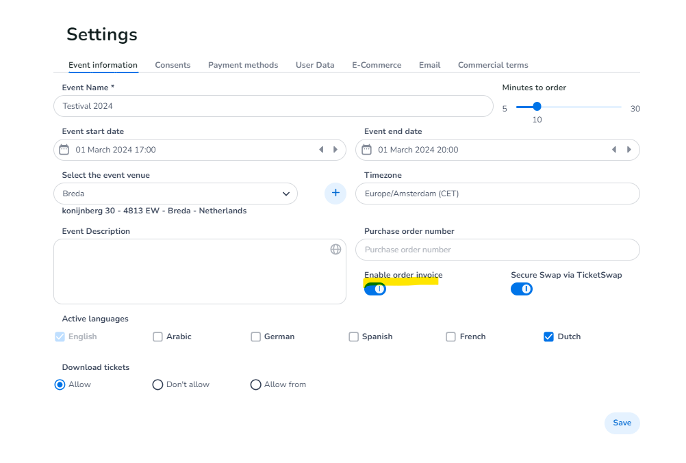 Navigate to your event and select Settings in the side menu. Then you switch on the option ‘Enable order invoice’ and save the event. Now it is possible for your visitors to request the invoice in the ticketshop.