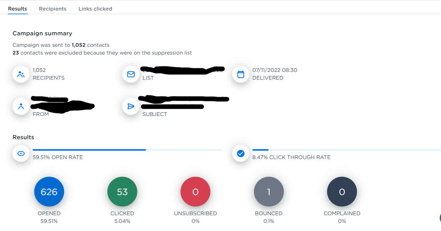 - Campaign Summary: Will give you a written summary to how many contacts the campaign was sent. And how many of these contacts were excluded based on blacklisting. People will be excluded based on blacklisting if they are on the suppression list.
