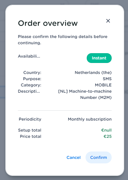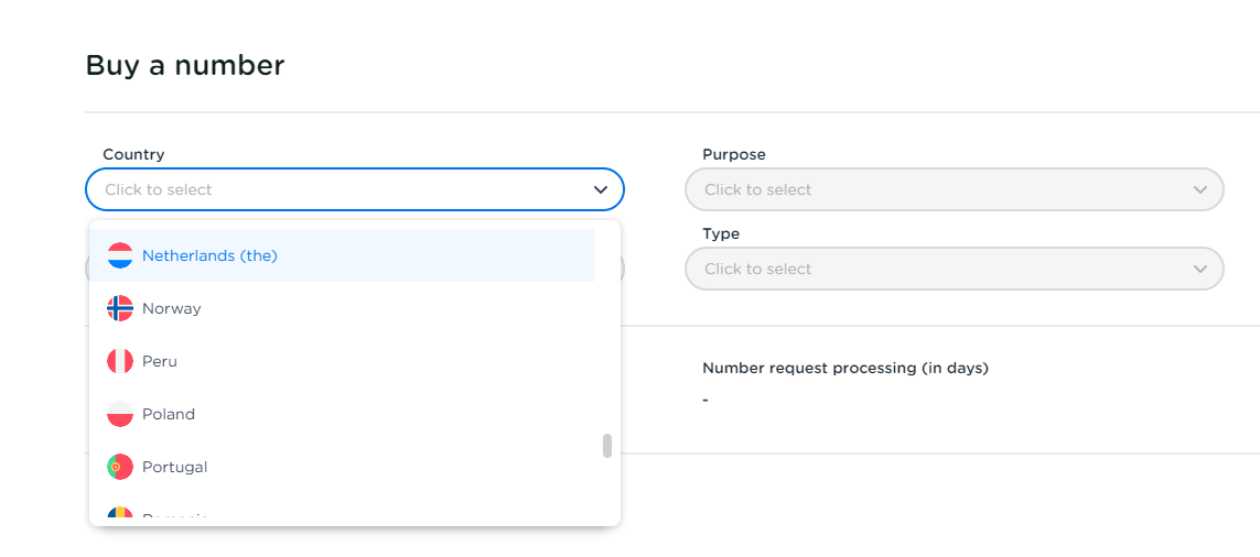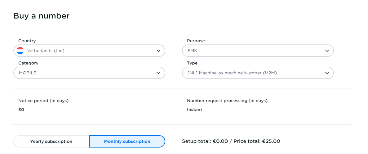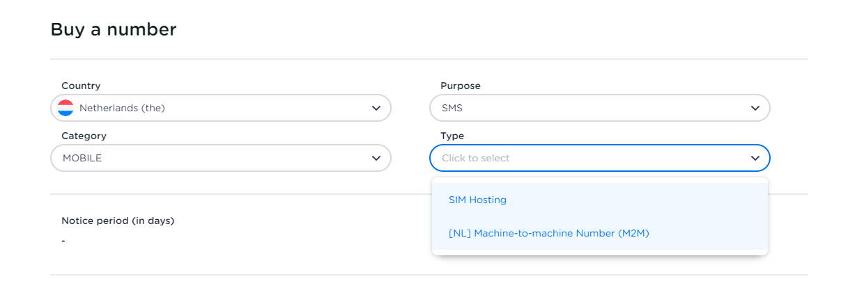 Select the Category (Mobile), purpose (SMS) and Type (physical hosted SIM or Virtual Number / 10DLC):
