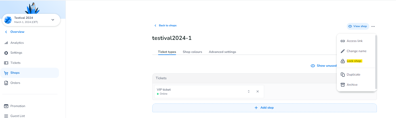 When the pre-sale is finished and the ticketshop needs to be accessible for everyone again, you can also un-lock the ticketshop.