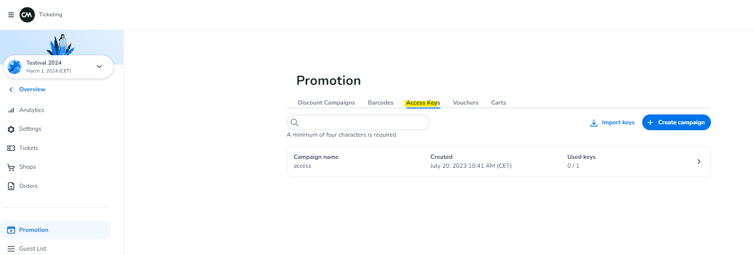 After generating the access keys, the ticketshop needs to be locked seperately: