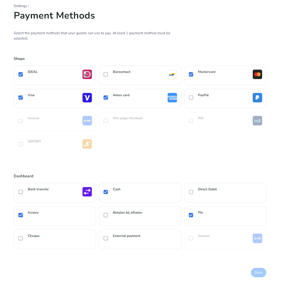You are always required to use at least 1 method for online payments and 1 for offline dashboard payments
