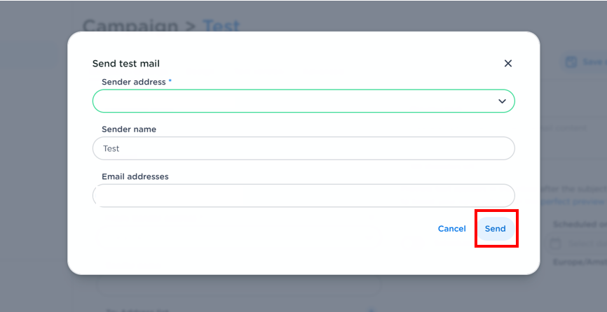 Select the correct sender address & sender name. Fill in the email addresses which receive the email in the row "email addresses" and press "Send"