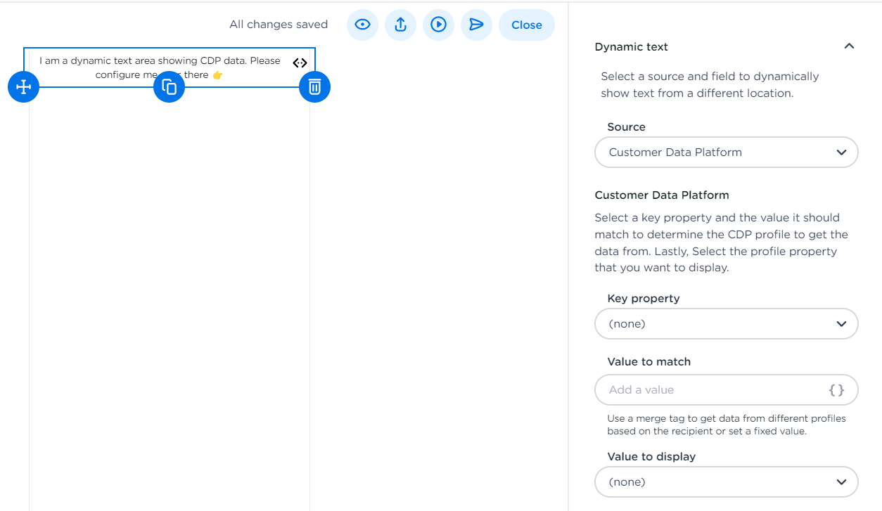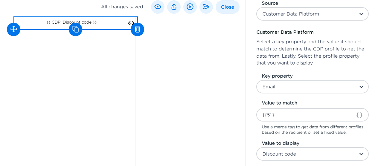 Value to match: this is the specific value for which will be searched in the key property column filled in above. If you want to show personalized data per recipient of the Page, you can add a merge tag like Email or Mobile phonenumber here. In that case it will search for the email address or mobile phonenumber of that specific recipient in the Customer Data Platform. You can also hard code a search option and not add a merge tag.