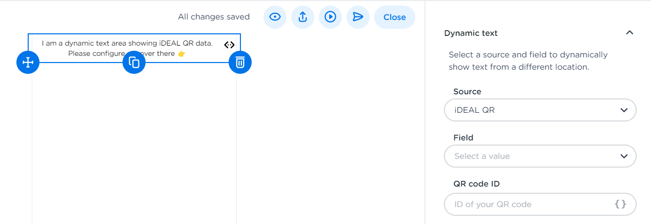 Dynamic text: Use this element if you want to show specific data of a person coming from the Customer Data Platform or via a specific iDEAL QR code.
