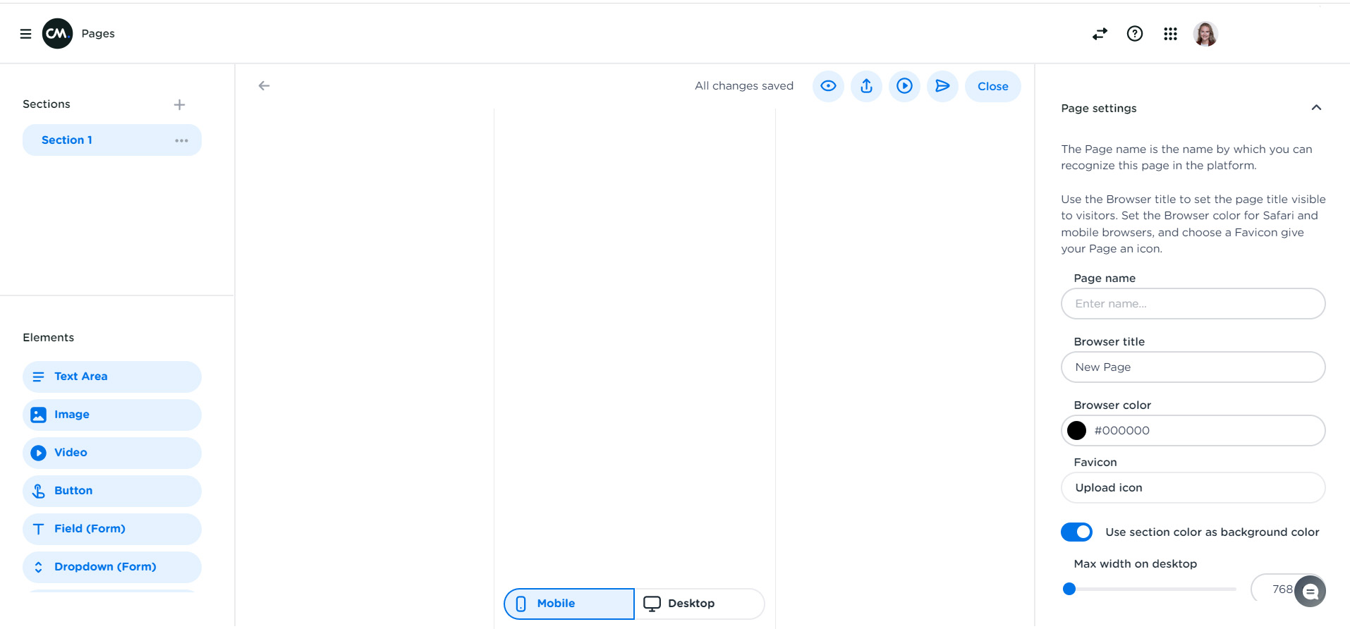 Payment: Use this element when you would like to add a payment button to your page. Please note that you need to have a CM payments account connected to your main account.