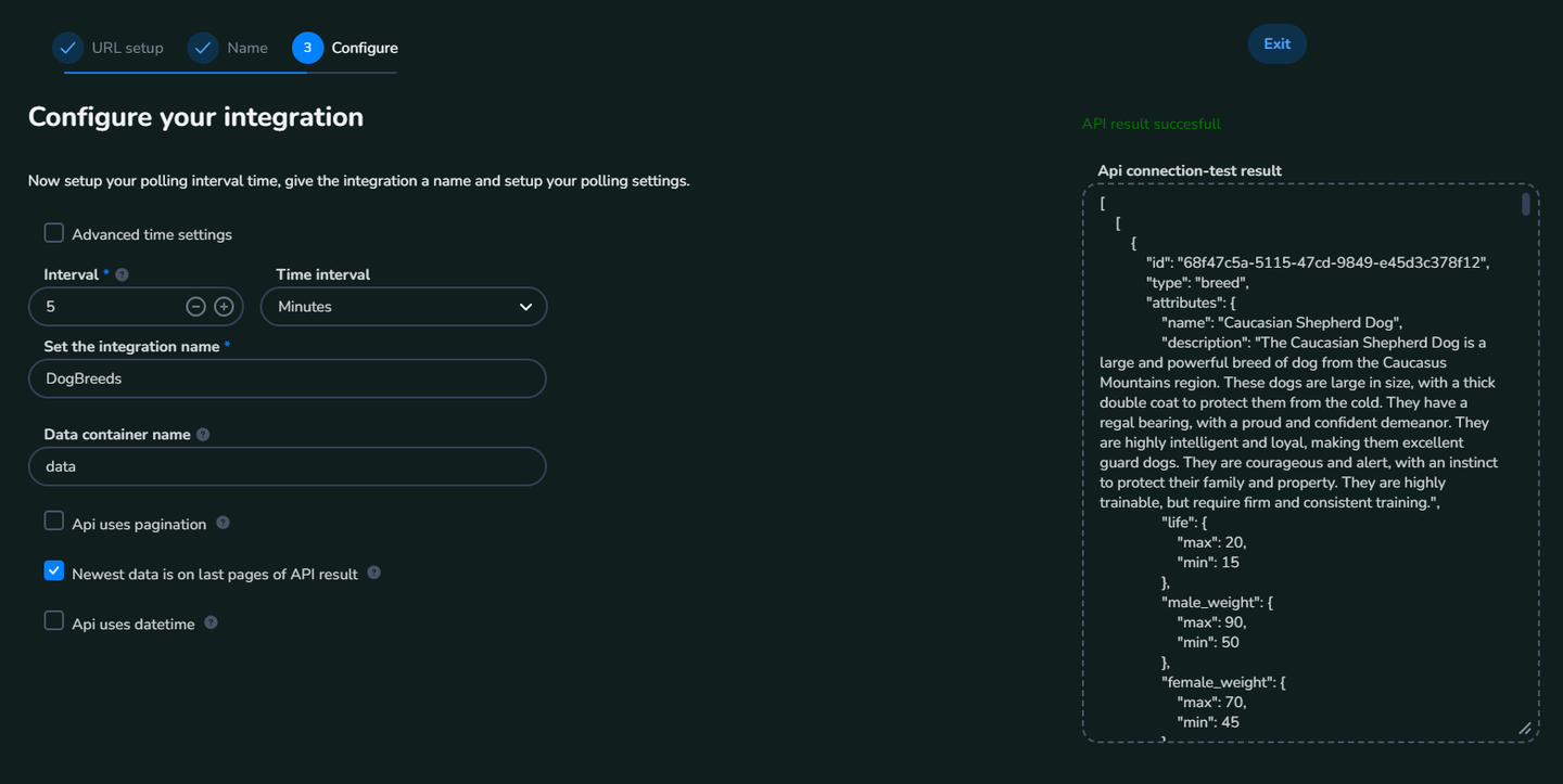 You will also need to setup the data container name. By default, the system will search for the result field in the result. Should the API result contain multiple result items, this will translate into multiple events sent to the events-api. Should the data not be specified in the field result field but in another field, please adjust accordingly.